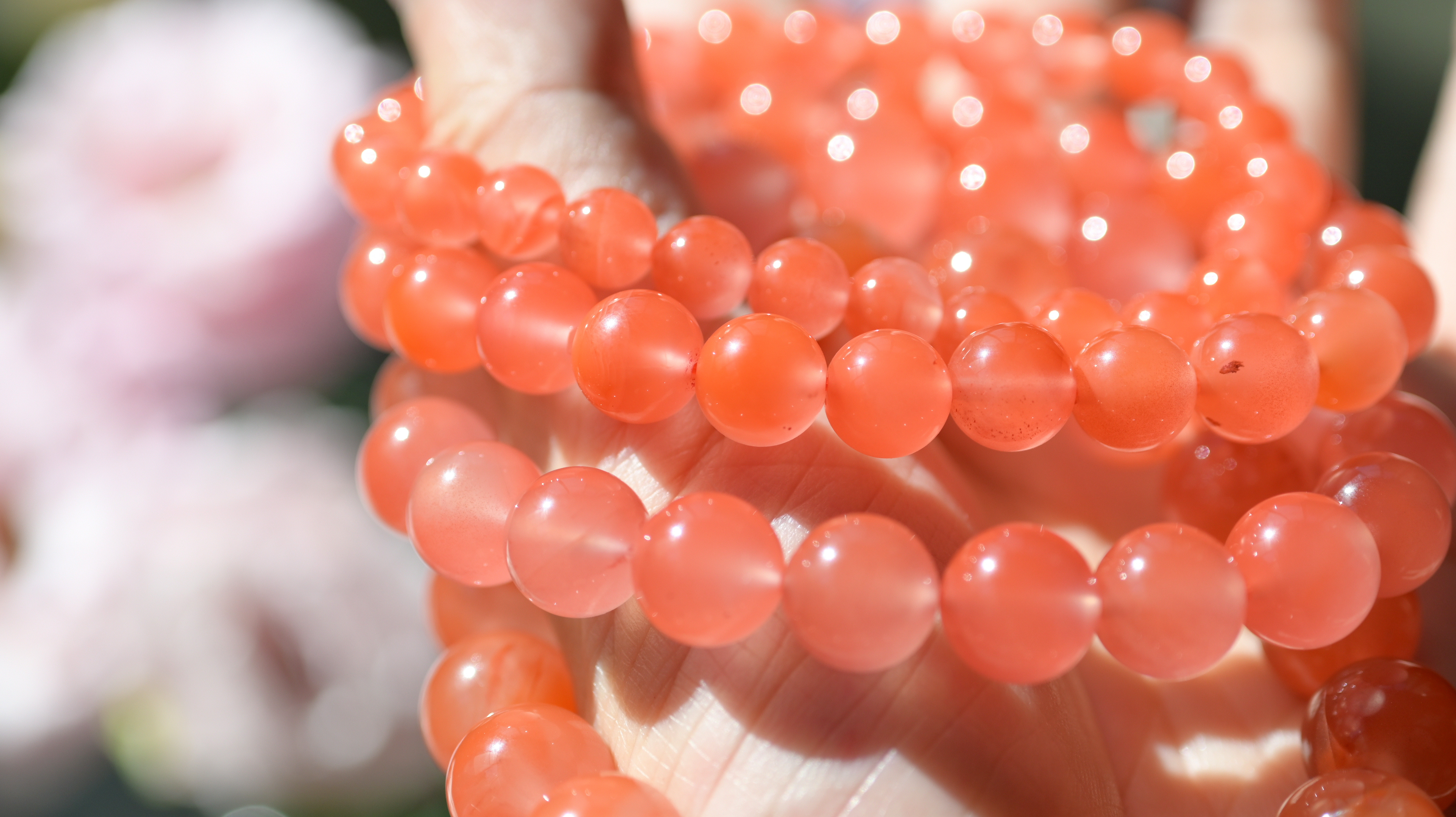 櫻桃紅瑪瑙帶著 柿子紅與橙粉的柔暖光感