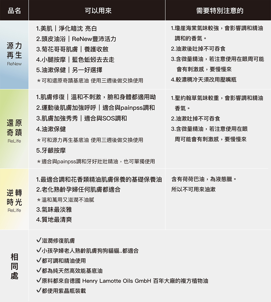 6. 也可和「活在愛裡」、「瞬間永恆」、「花盛開」...等花朵兒類精油調和成臉部護膚油,但因為源力再生.純植基底油內含的瓊崖海棠油氣味較重,因此花類氣味會稍微被掩蓋,若介意影響香氣的呈現,可改與 【逆轉時光.純植基底油】 調和使用。使用臉部或較敏感的肌膚比例大約是10ml植物油+2-4滴純精油