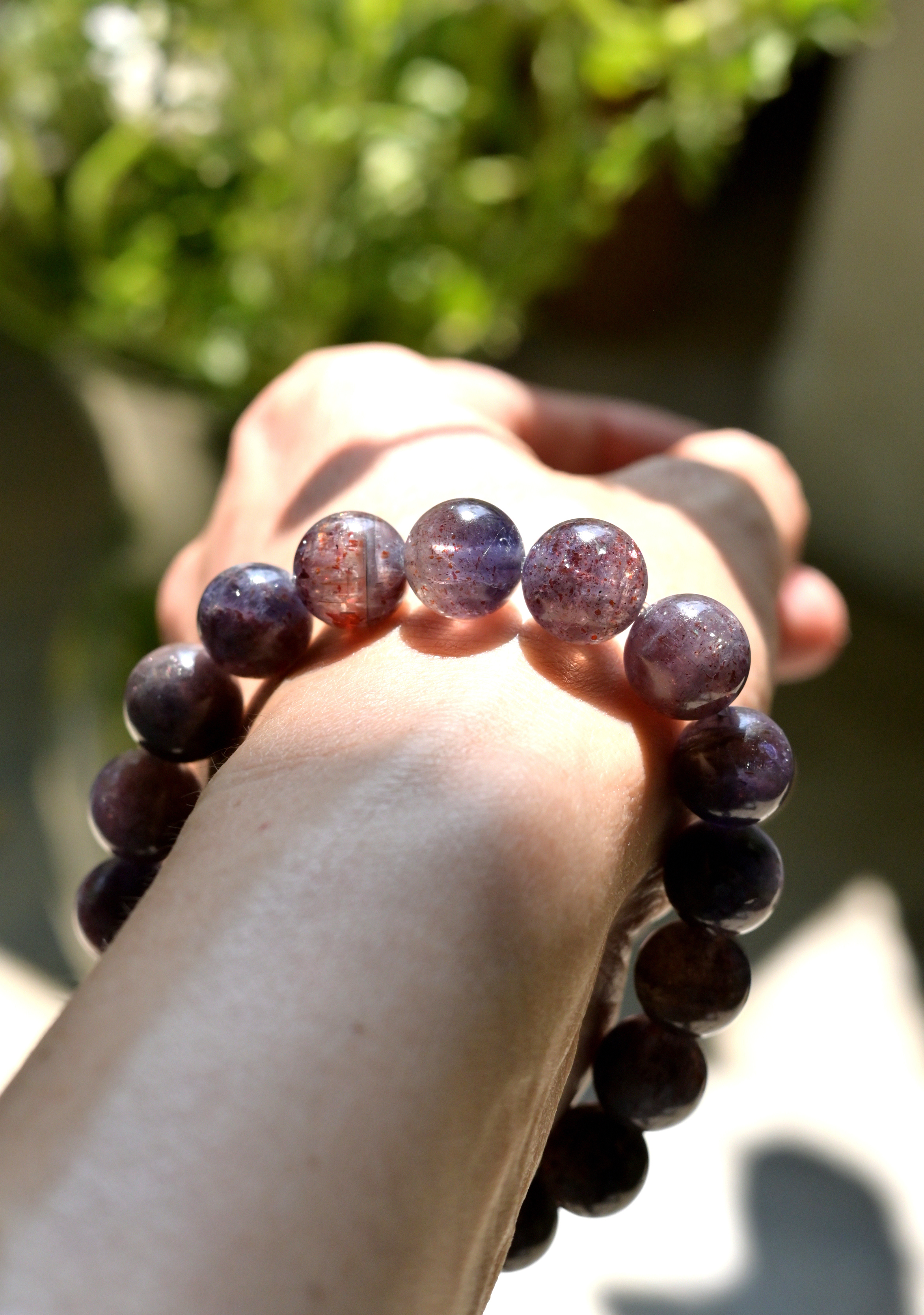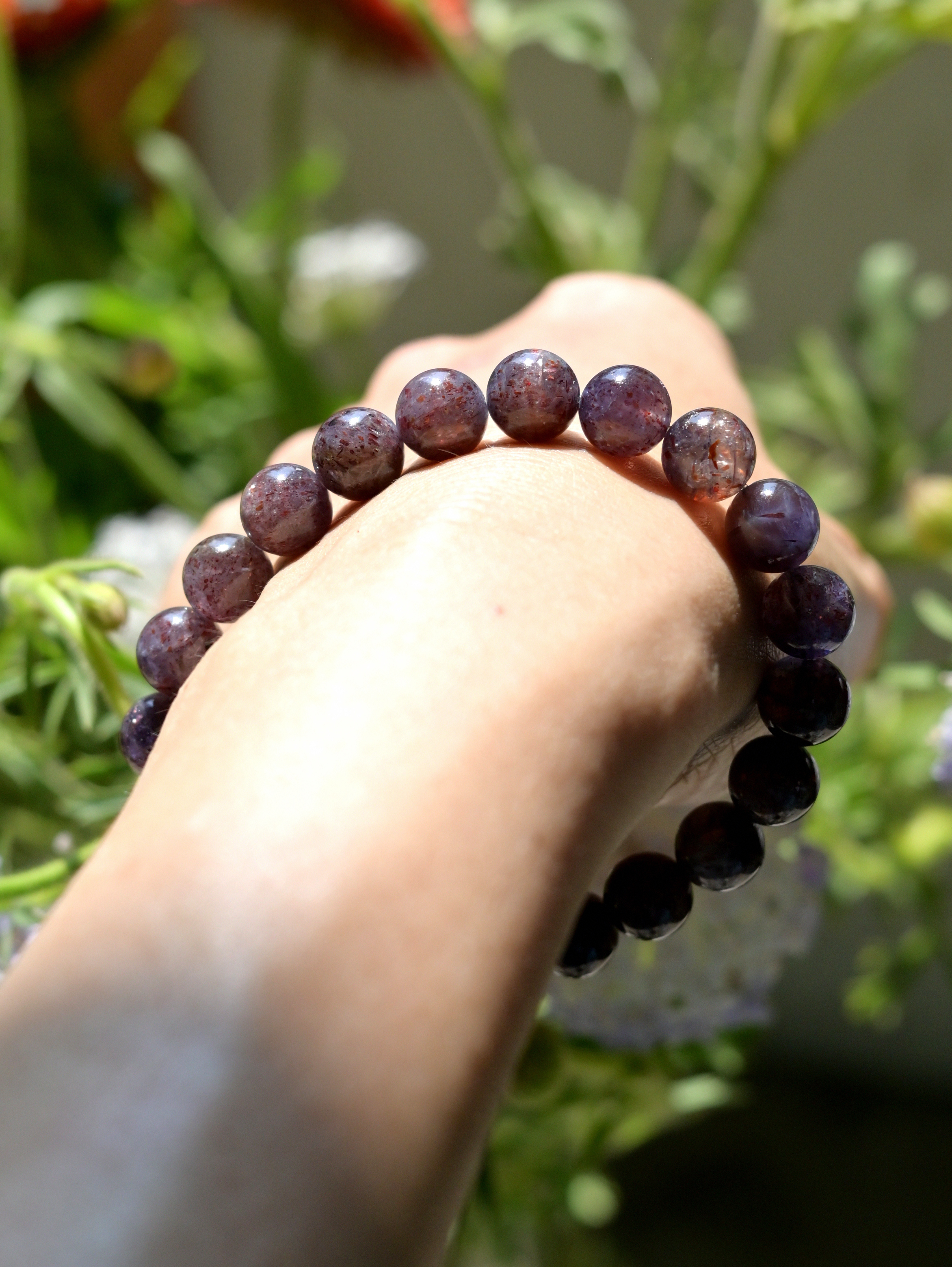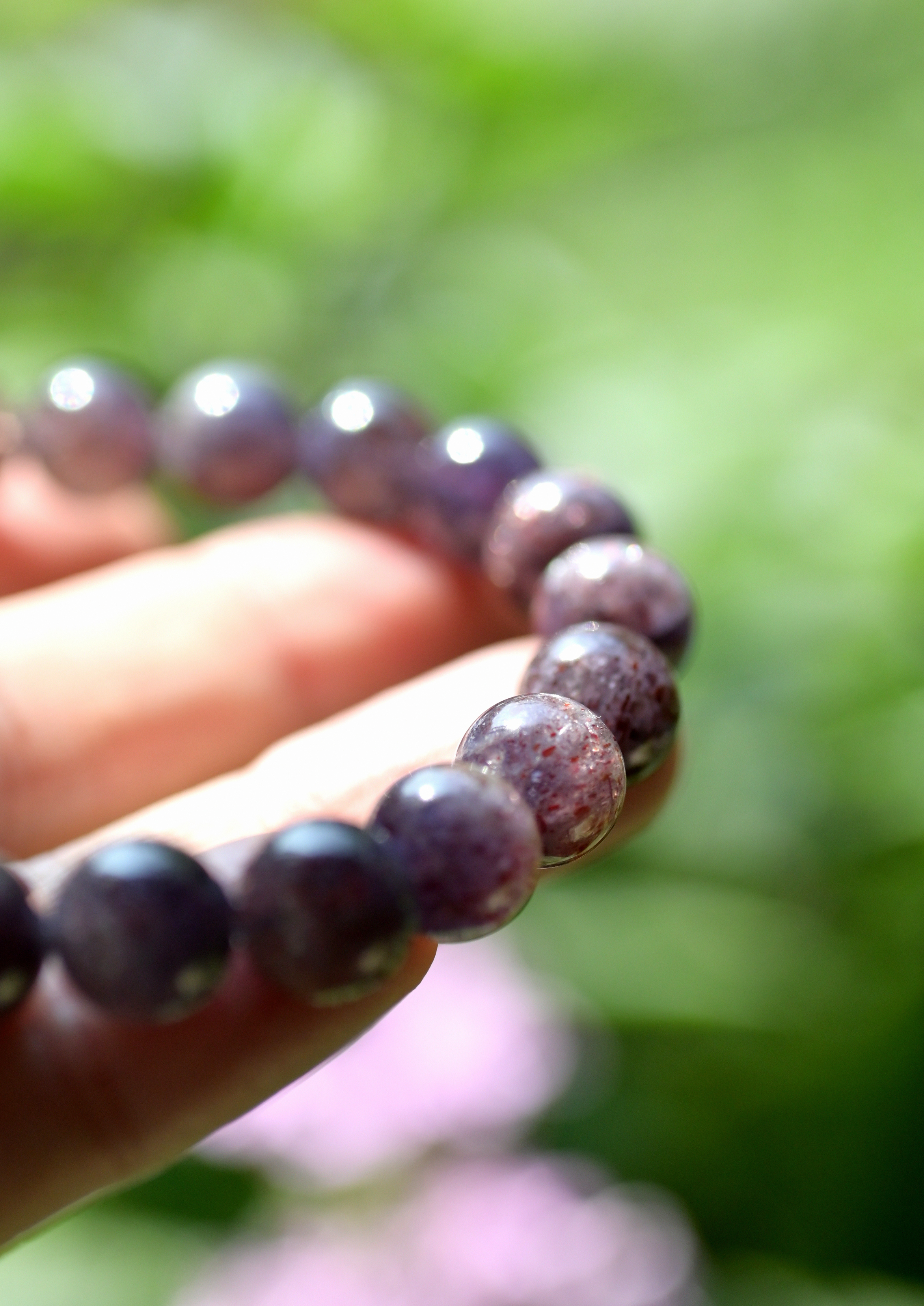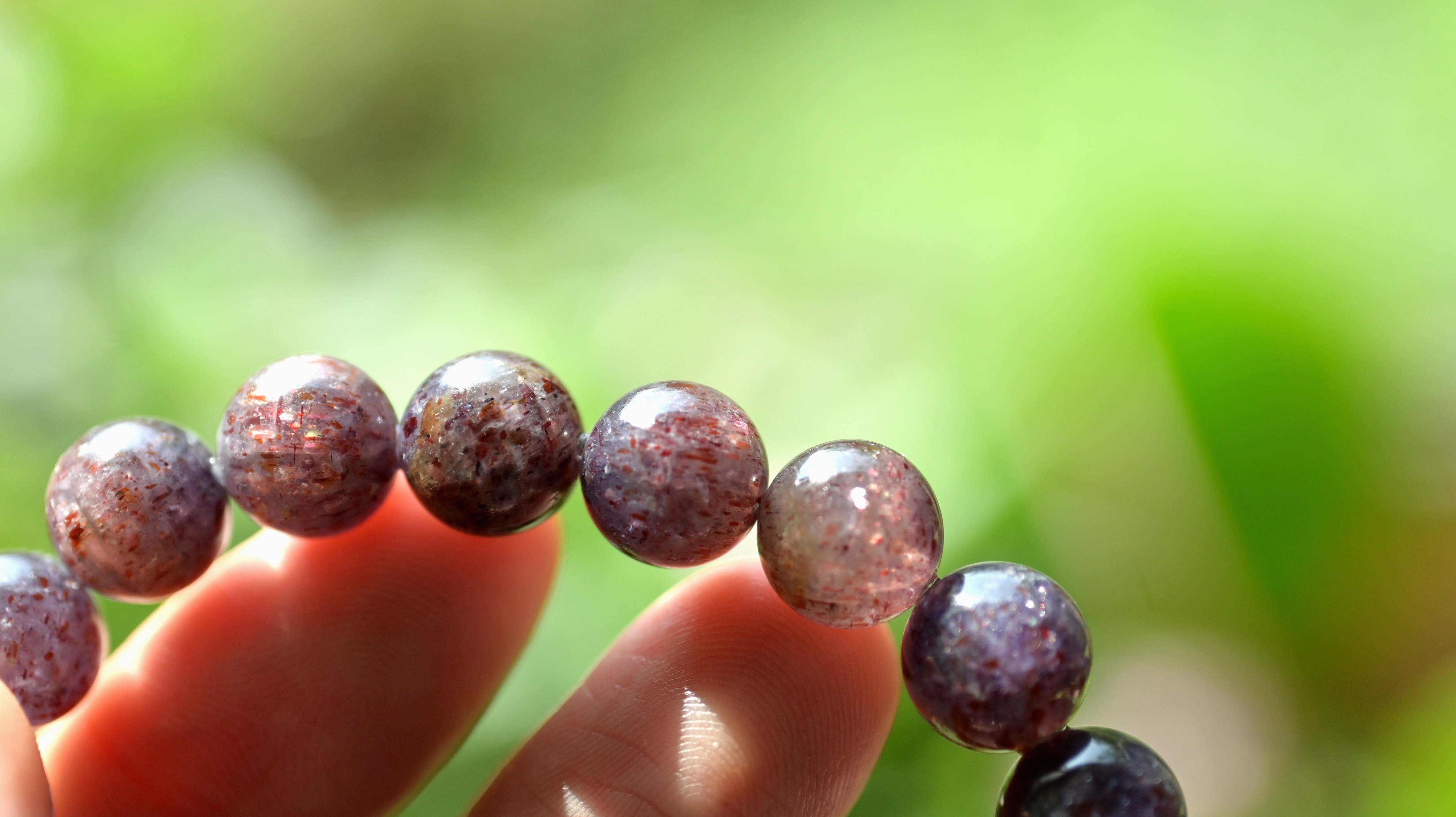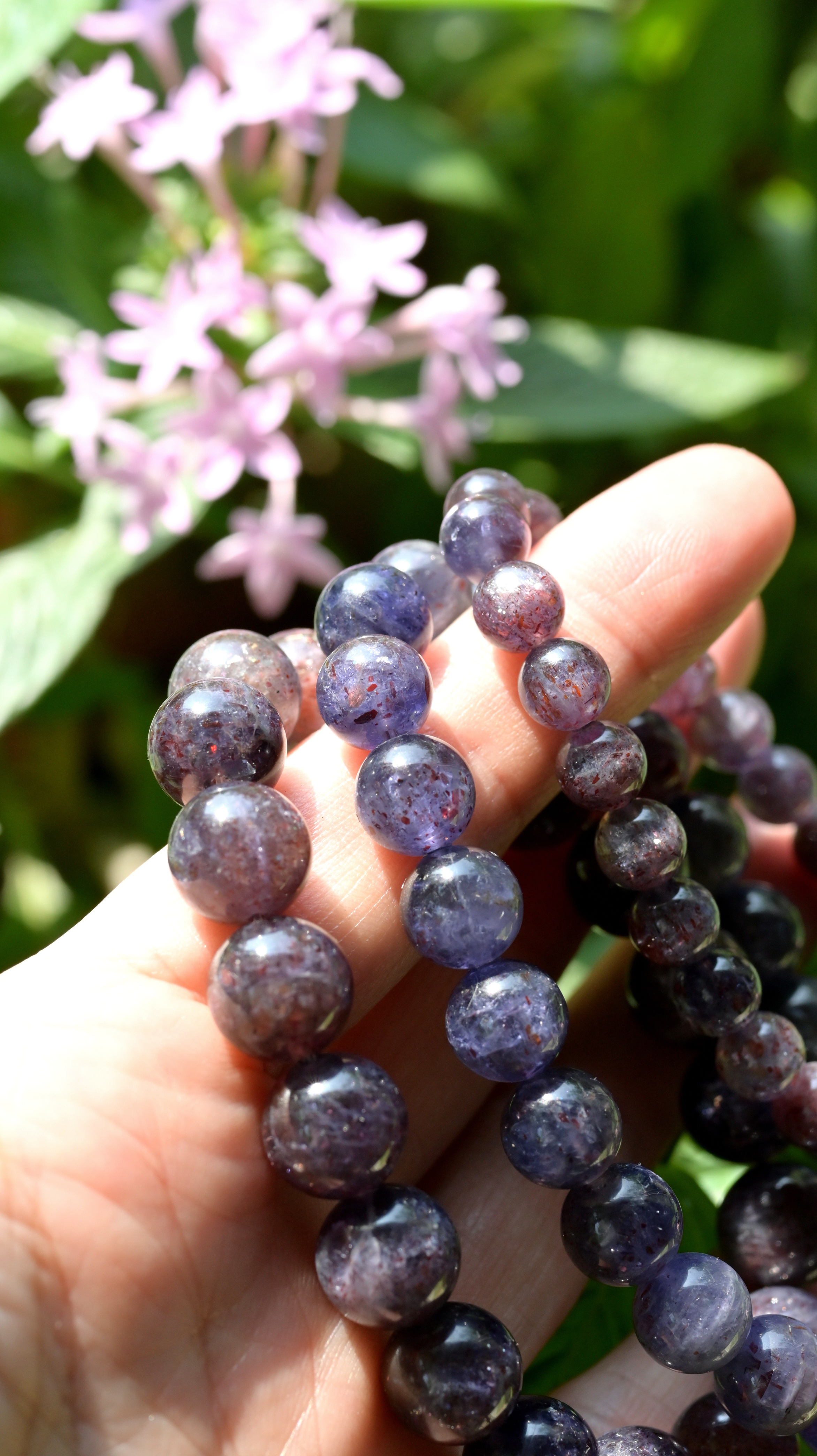 由於內含「赤鐵礦或針鐵礦」包裹體,氧化鐵薄片呈板狀或針狀,會讓藍紫色的堇青石帶有微微的橙紅色,品質好具有較強的光澤與潤度,透過陽光可見點點如血滴般如星空絢爛