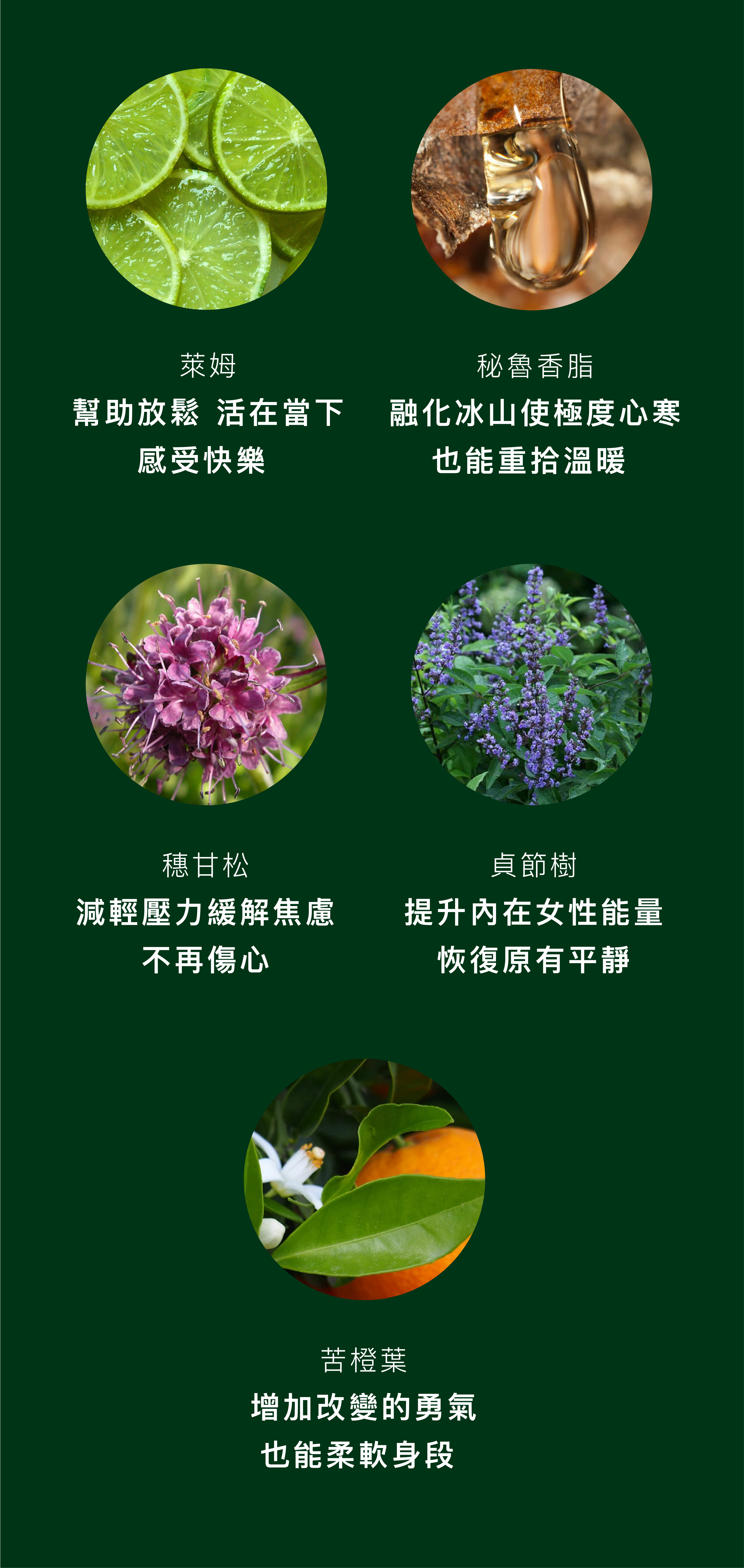 萊姆活在當下的快樂果香,苦橙葉的療癒放鬆,對女性能量能大提升的貞節樹精油,以及珍貴稀少有著 強大的寬恕轉念能量的穗甘松,有著融化冰山巧克力溫香的秘魯香脂 做為尾韻...幫助我們 穩固扎根連結地心能量,化解創傷糾結