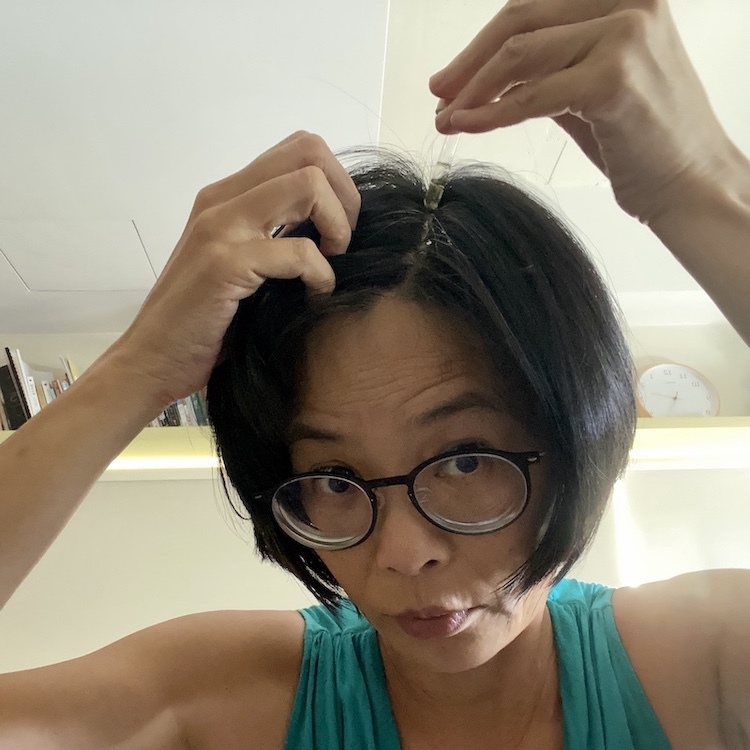 先將頭髮分線露出頭皮,將吸管中的hair髮油,慢慢均勻的滴入頭皮上。