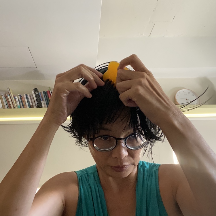 全頭皮均勻上完油後,可以用蜜蠟刮痧板或按摩梳按摩頭皮,最後用毛巾包起來,若是家中有蒸汽機這時使用可加強吸收力。
