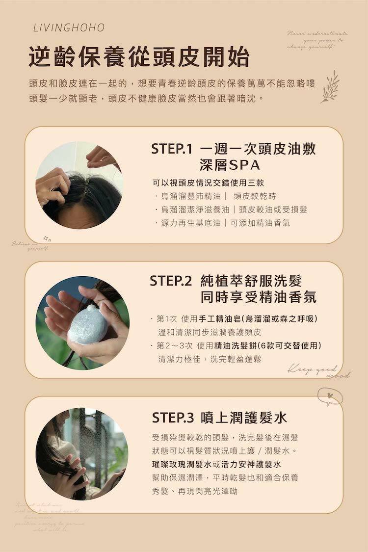 5. 做完頭皮油浴後,使用歲月淨好手工皂/烏溜溜豐沛手工精油皂/幸福御守精油髮餅/皂水清洗2-3次,如果第一次洗沒有泡沫屬正常現象。