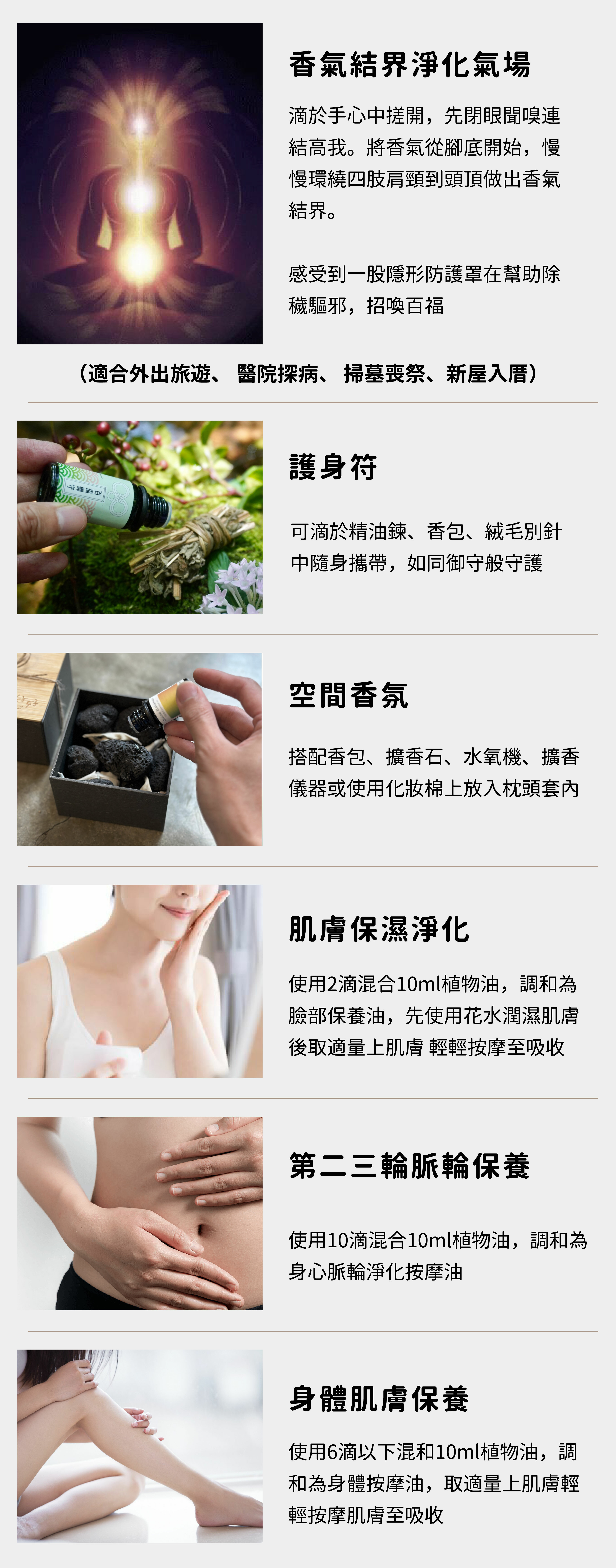 外出旅遊、 醫院探病、 掃墓喪祭、新屋入厝,都很適合將 【百福御守】 滴於手心中搓開,先閉眼聞嗅連結高我。再將百福香氣從腳底開始,慢慢環繞四肢肩頸到頭頂做出香氣結界。 高敏共感人一使用就能馬上感受到一股隱形防護罩在除穢驅邪 |招喚百福