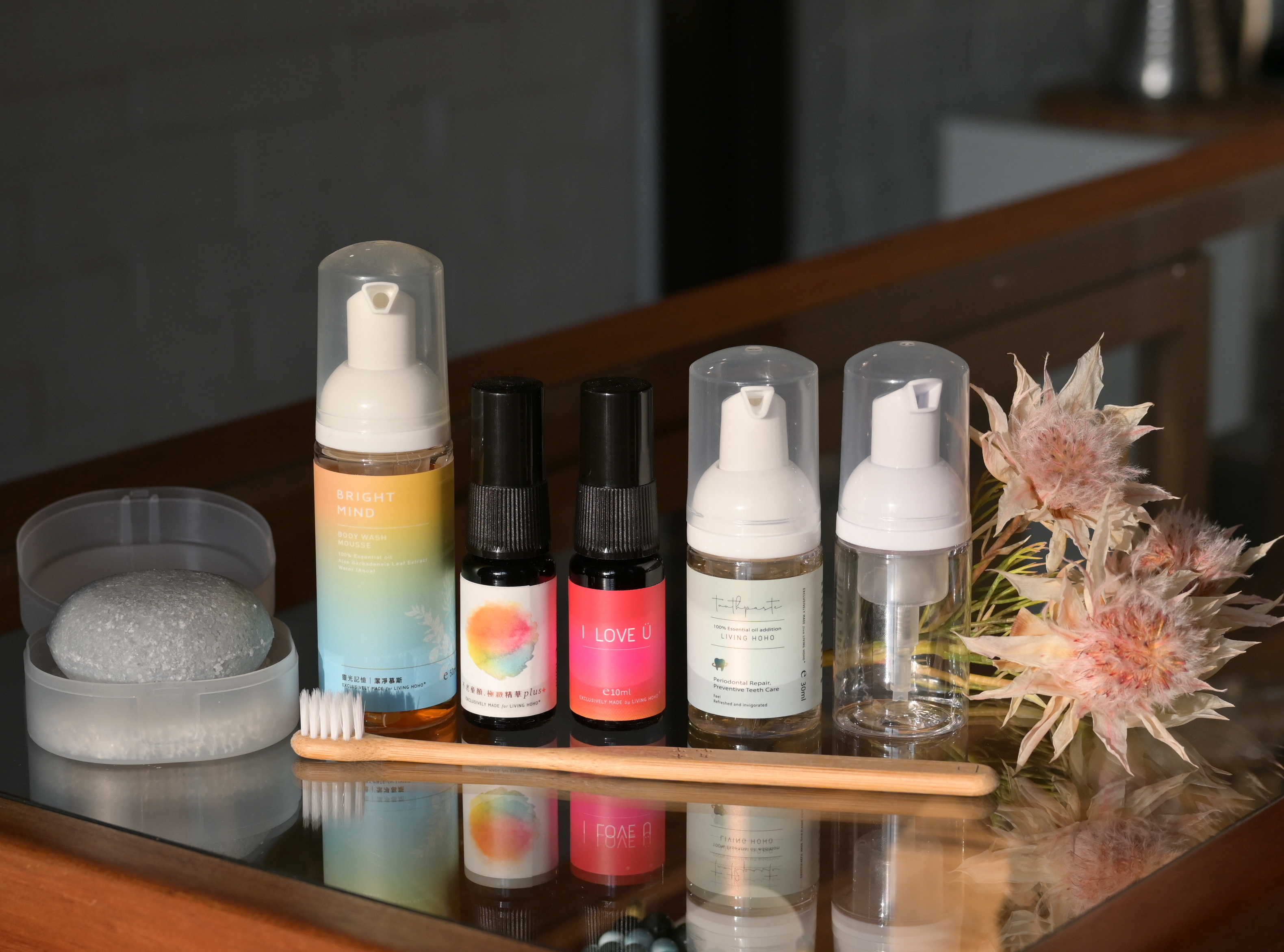 好好精油.幕斯牙膏、靈光記憶潔淨慕斯、不老童顏.極致精華油、我愛你.賦活植萃精華油、精油洗髮餅、髮餅收納盒、好好.極細刷頭軟毛竹柄牙刷,以及 30ml 慕斯瓶,輕鬆滿足旅行日常所需