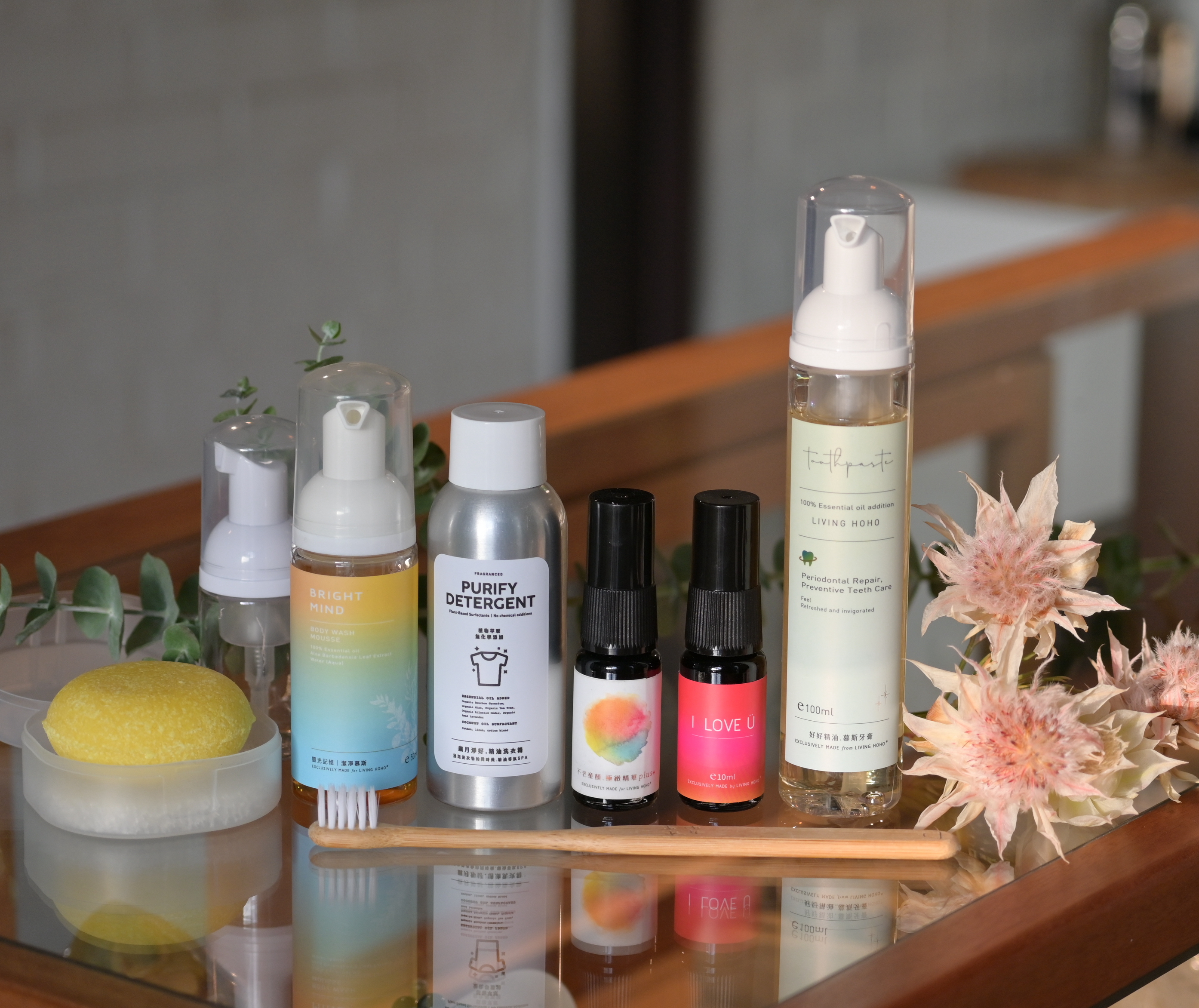 好好精油.幕斯牙膏、靈光記憶潔淨慕斯、不老童顏.極致精華油、我愛你.賦活植萃精華油、精油洗髮餅、歲月淨好.精油洗衣精隨身瓶、髮餅收納盒、好好.極細刷頭軟毛竹柄牙刷,以及 30ml 慕斯瓶,輕鬆滿足旅行日常所需