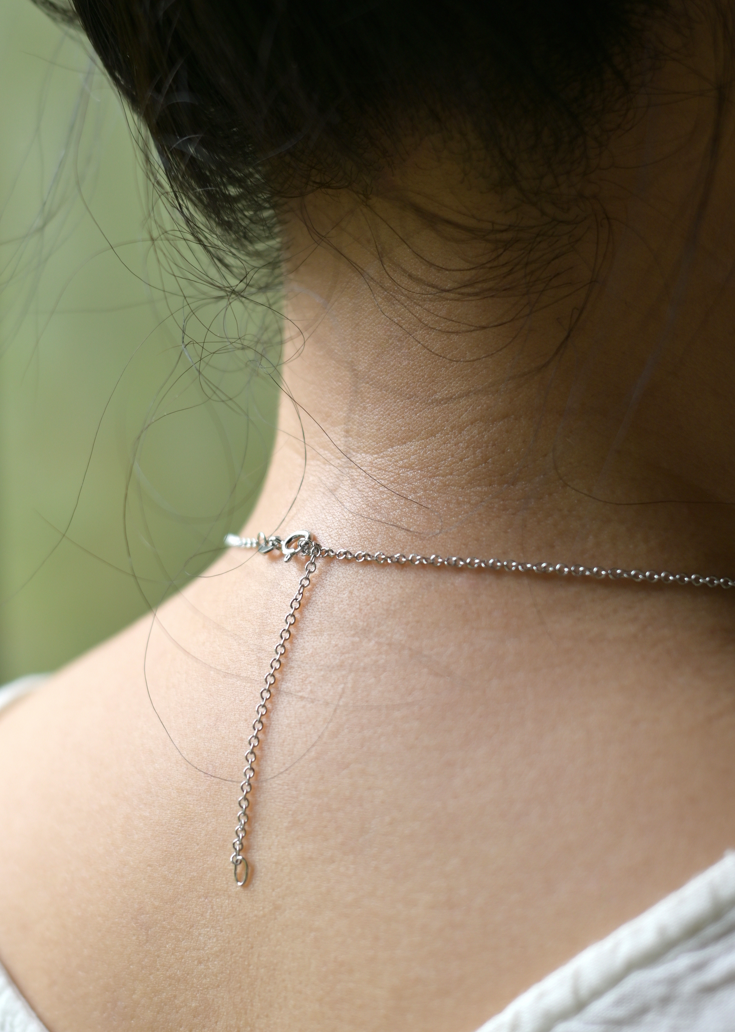此款925純銀項鍊 可調整兩種長度尺寸呦。分別為41.7cm,為中等身材東方女性鎖骨鏈位置,這個位置較接近喉輪:喉輪能量失衡時,常有話說不出,或說出違心論,或講話過多,過快,過亂,言不及義...都可選擇此長度來配戴水晶礦石,來協助喉輪能量更容易平衡