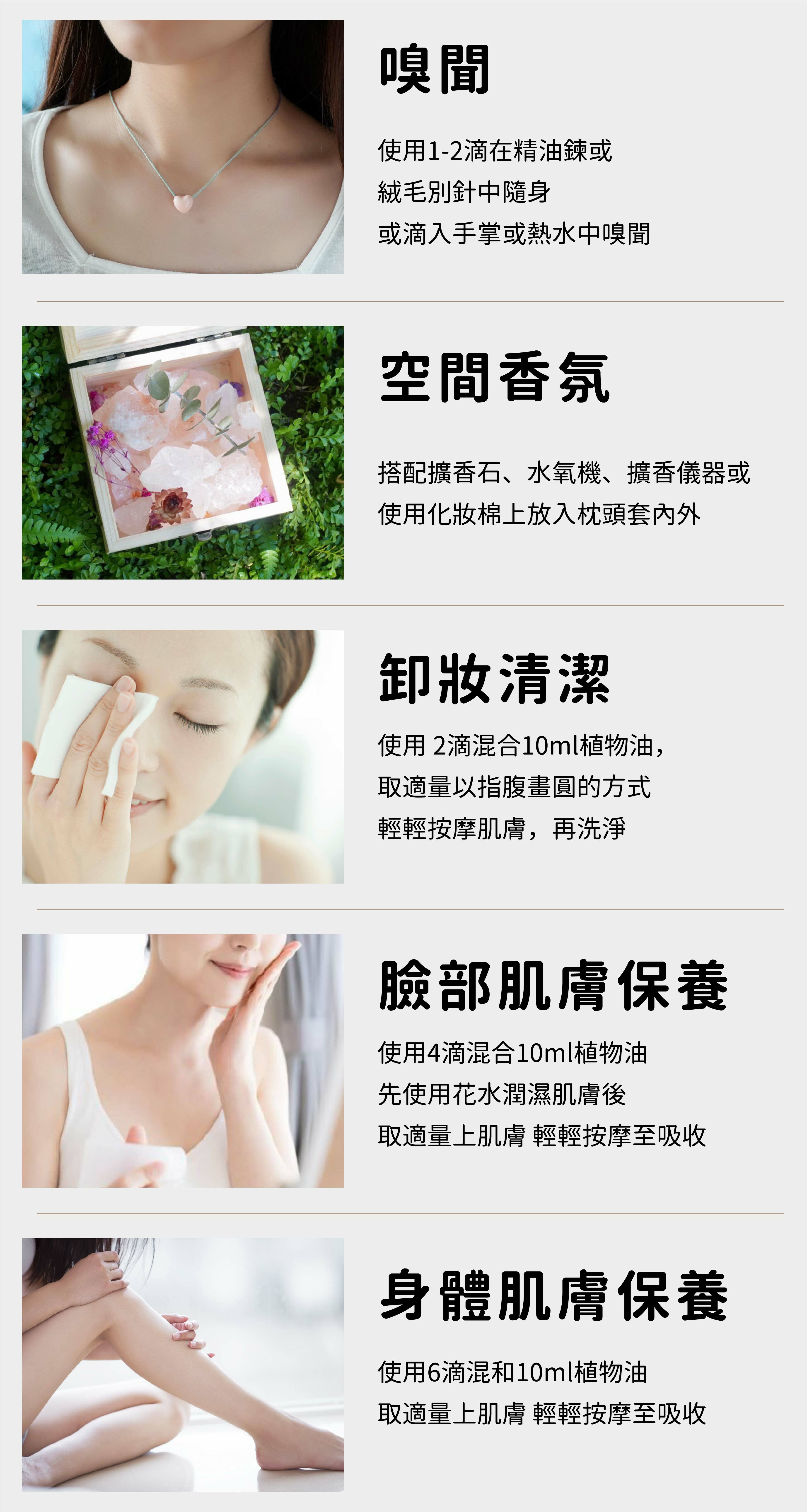 1. 此商品為100%純精油,避免直接使用在大面積肌膚上,務必按照使用說明稀釋使用在肌膚上按摩。