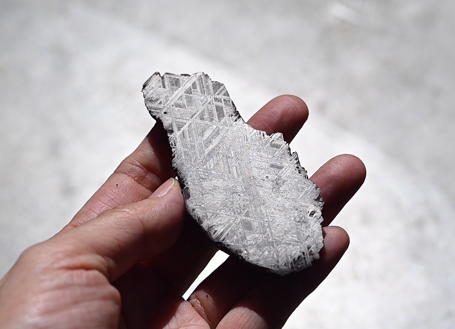 鎳鐵隕石最大特徵為切開後會有 維德曼交角(Widmanstatten Pattern) 圖案←分辨天鐵真假 就是看「維德曼交角」是否呈現獨一無二的非重複的規則紋路