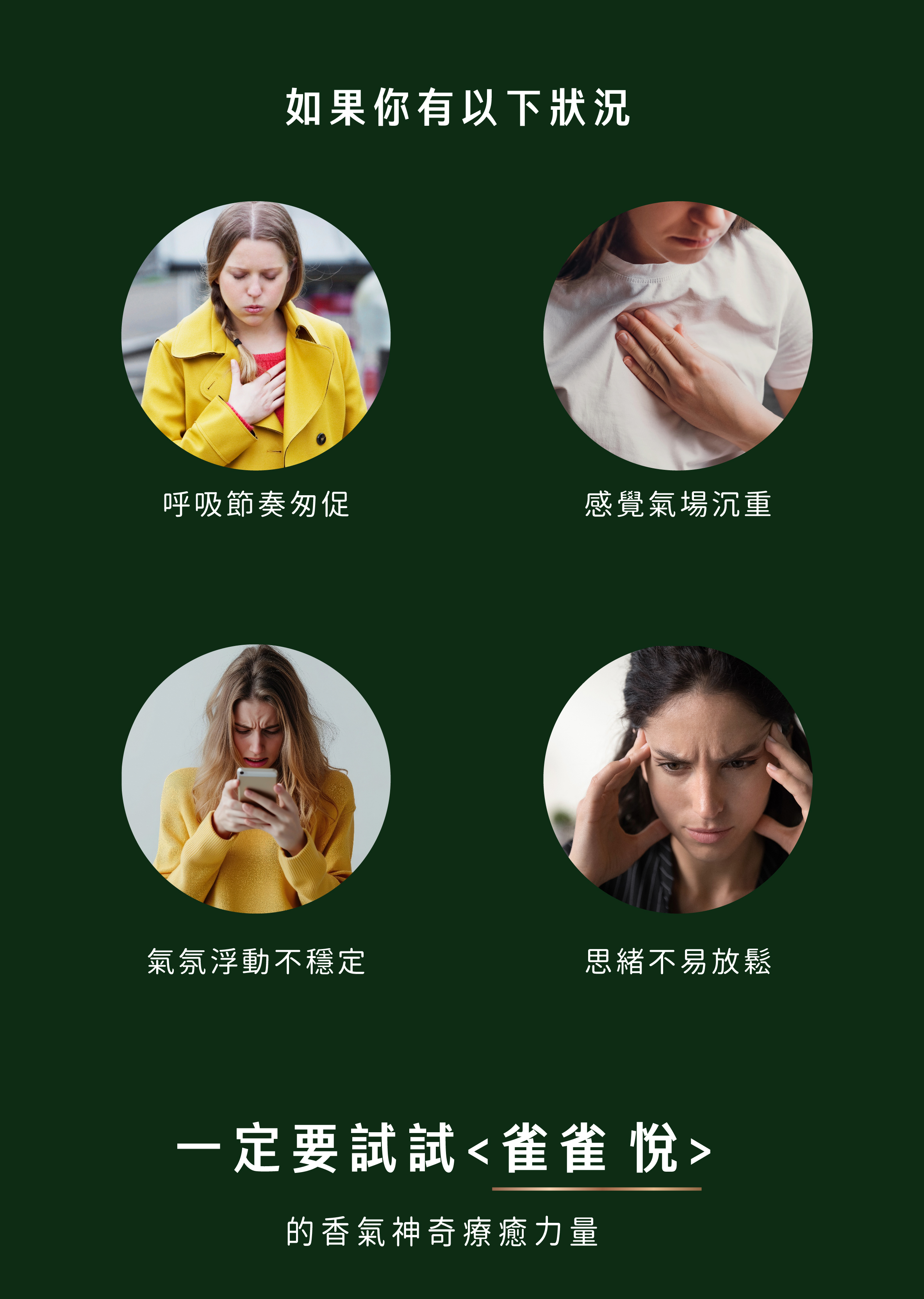 雀雀悅精油十分適合『缺乏自信 沒有快樂感覺』的人,生活總被什麼追著跑而感到生活節奏緊繃的你。
